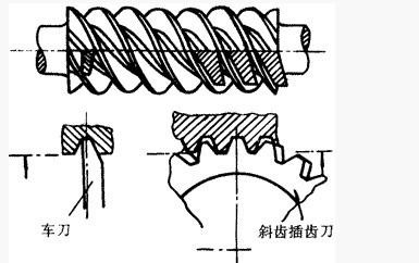 阿基米德蝸桿螺旋面的形成與螺紋的形成相同,通過蝸桿軸線并與蝸輪軸線垂直的平面為中間平面,阿基米德蝸桿和蝸輪在中間平面上是齒條與漸開線齒輪的嚙合,而垂直于蝸桿軸線的剖切平面與蝸桿齒廓交線的端面齒廓為阿基米德螺旋線。阿基米德通常在無需磨削加工的情況下廣泛應用,當需磨削時需采用特制截面形狀的砂輪。